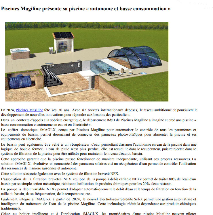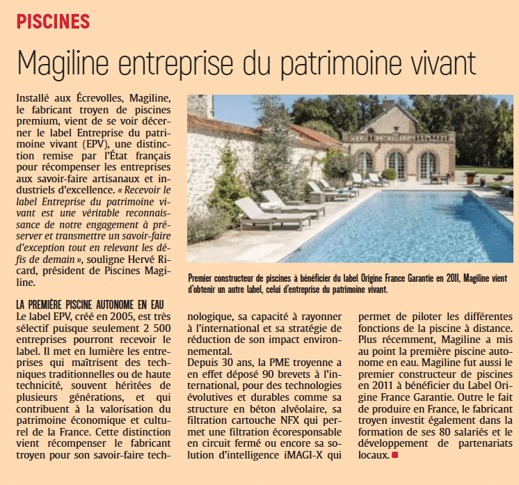 Piscines Magiline ist das erste Unternehmen der Schwimmbadbranche, das das renommierte Label „Entreprise du Patrimoine Vivant“ (EPV) erhalten hat, eine staatliche Auszeichnung für hervorragendes handwerkliches und industrielles Know-how.